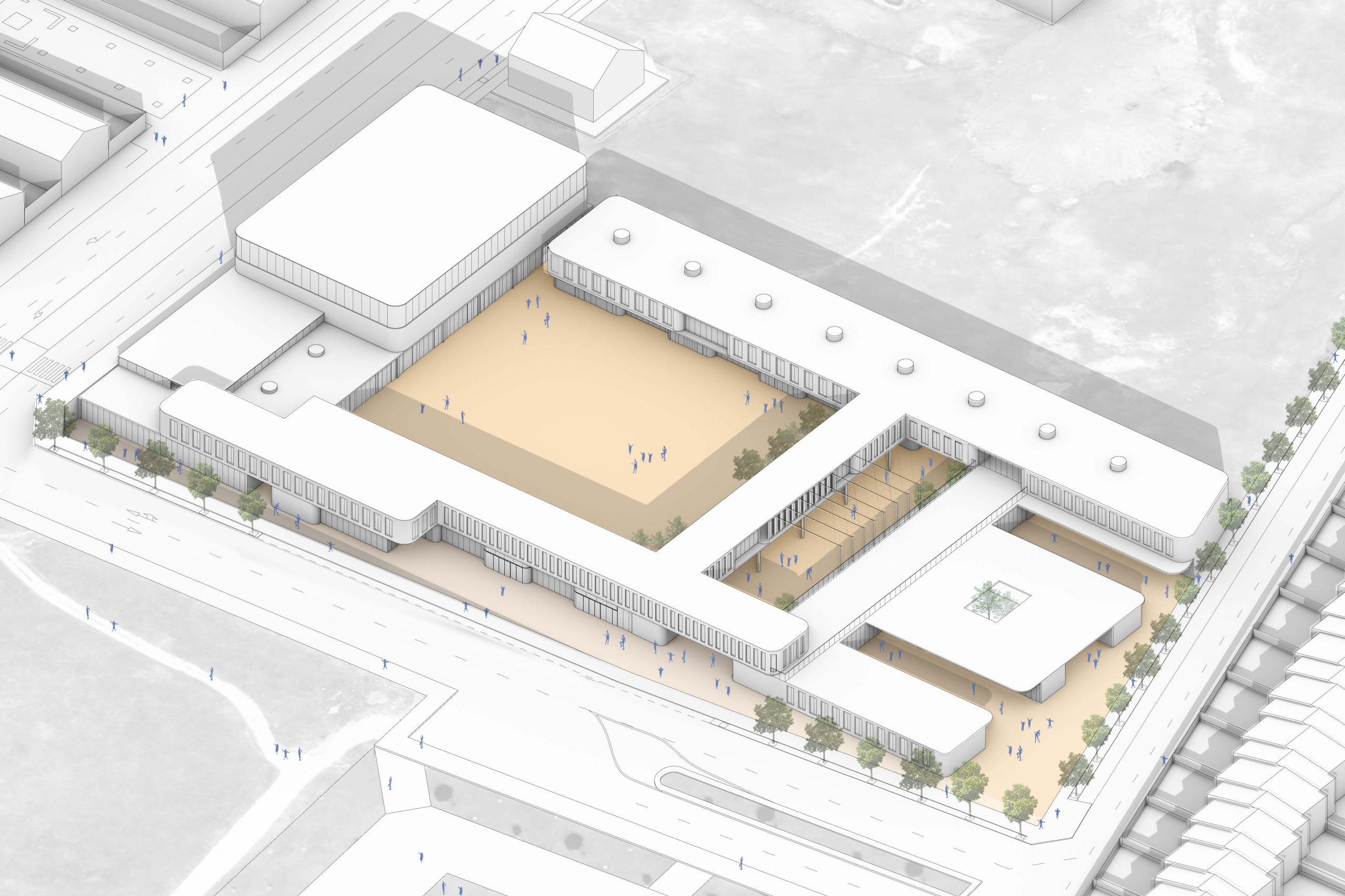 Exterior view. Main courtyard and sports area