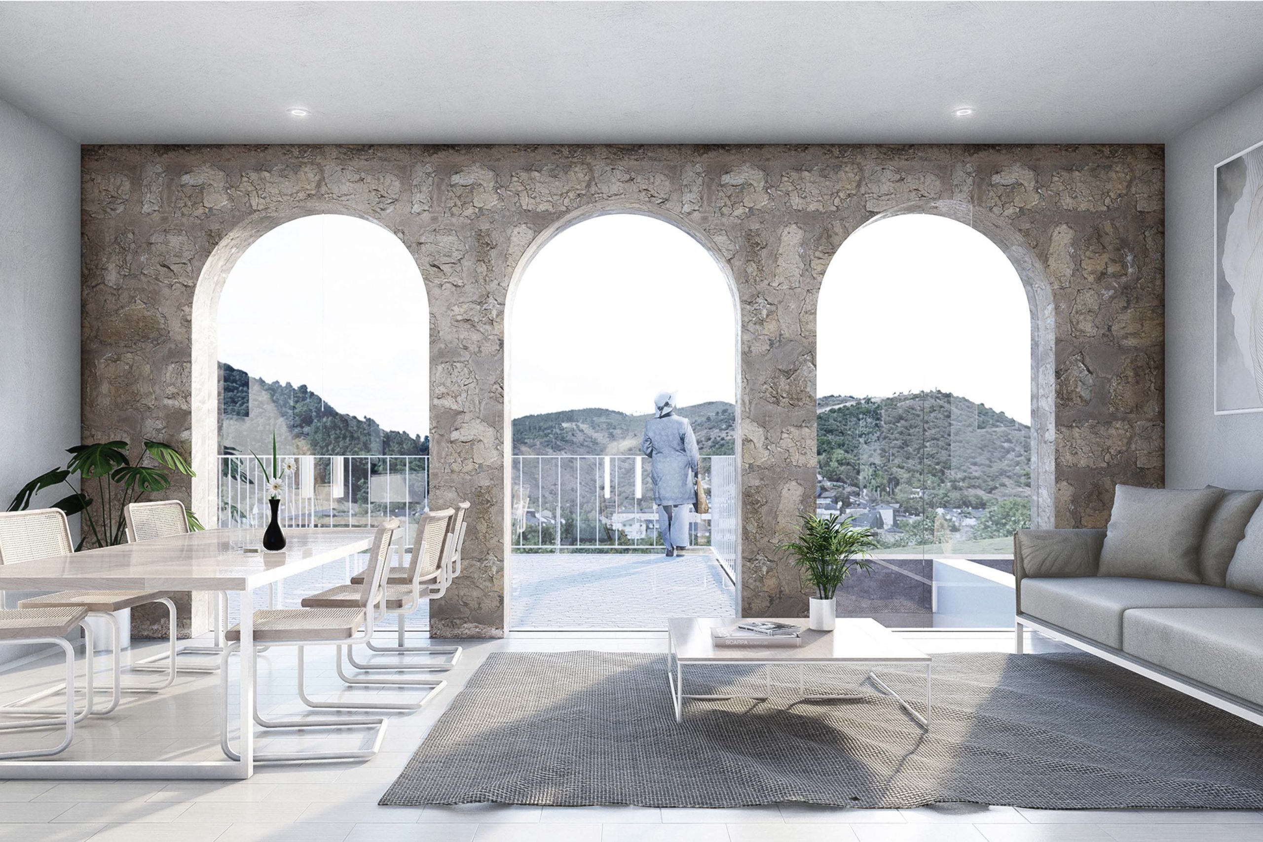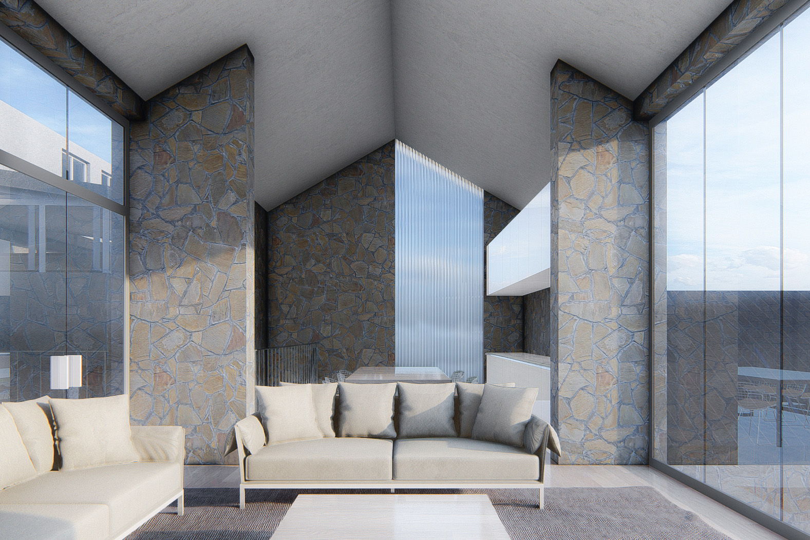 OPTION A. Interior view. Living room and the terrace open to the landscape